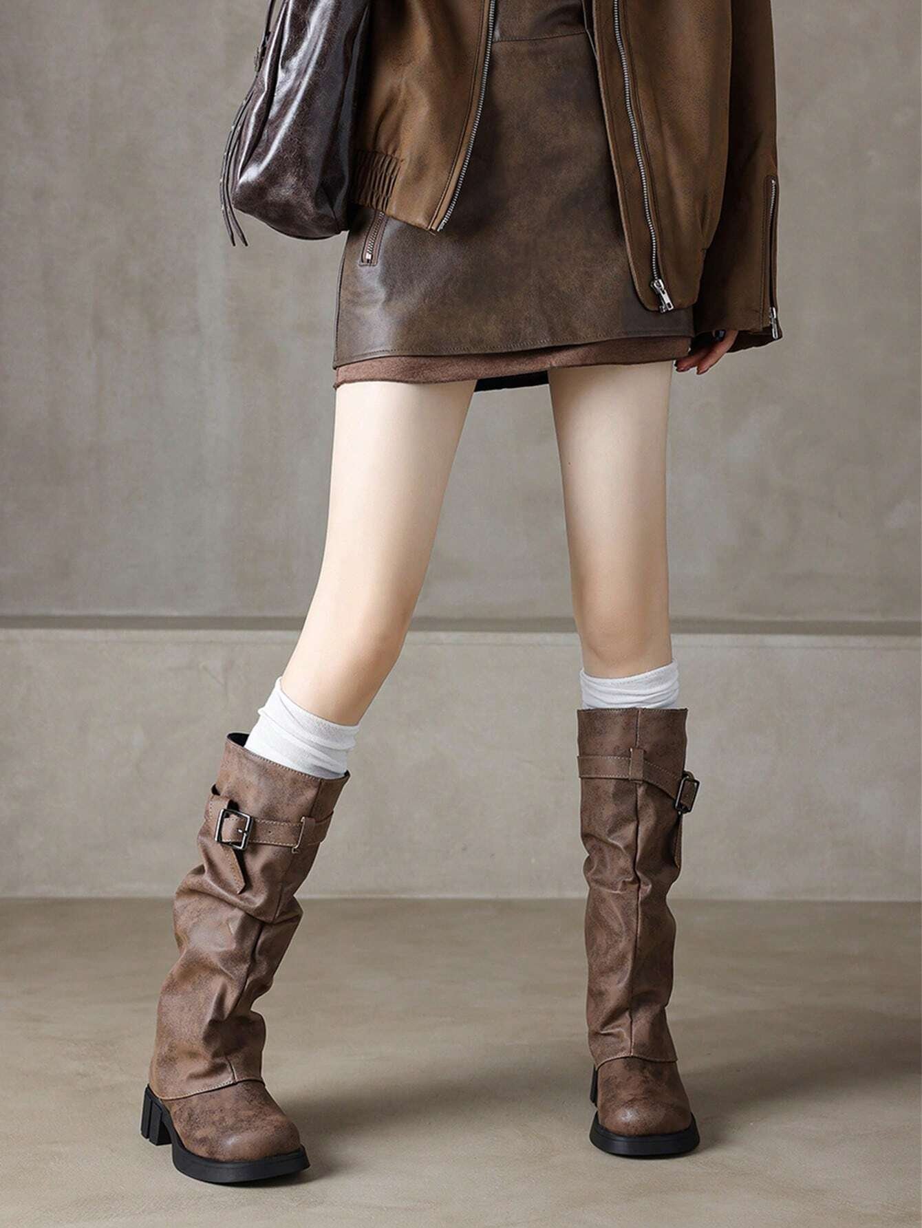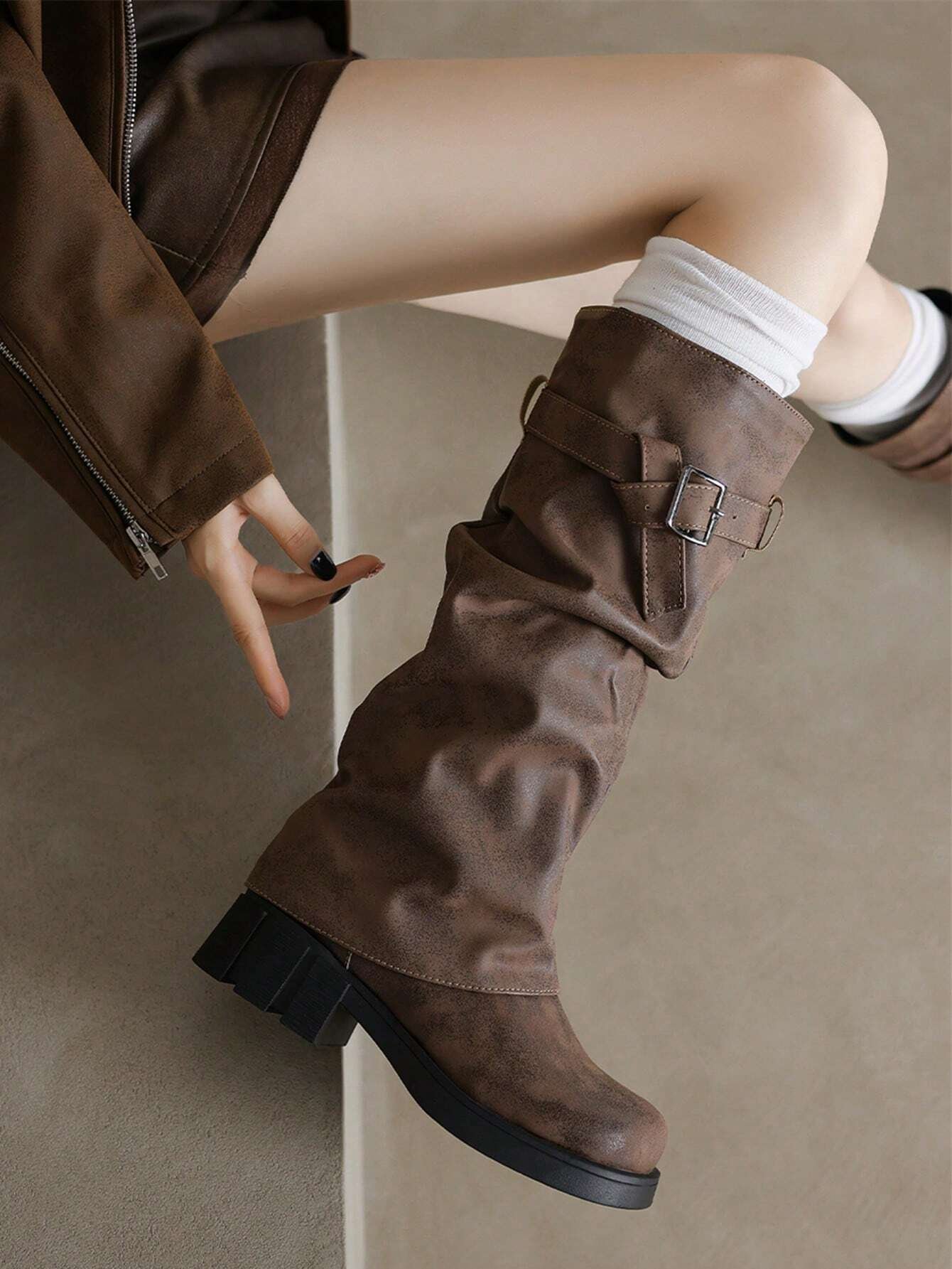 2025 New Vintage Mid-Heel Fashion Boots For Women, Distressed Riding Boots With Buckle, Low Heel Cowgirl Boots Square Toe