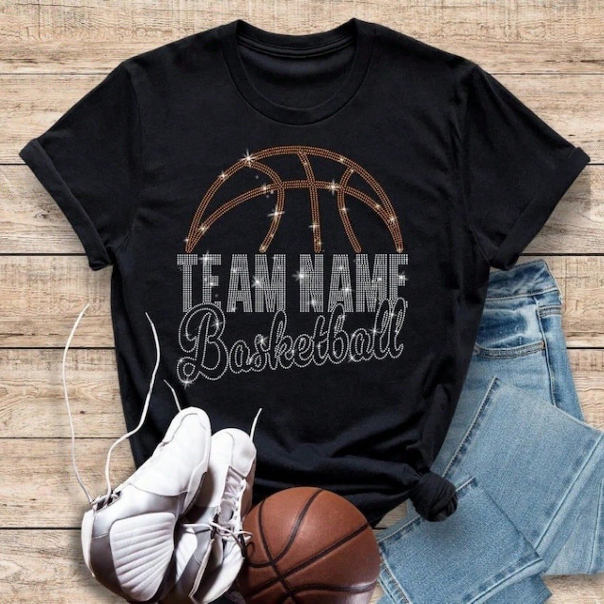 Custom Team Name Basketball Rhinestone T-Shirt, Customizable Game Day Tee-Shirt, Unique Design Top For Sport Lovers, Basketball Mom Shirt