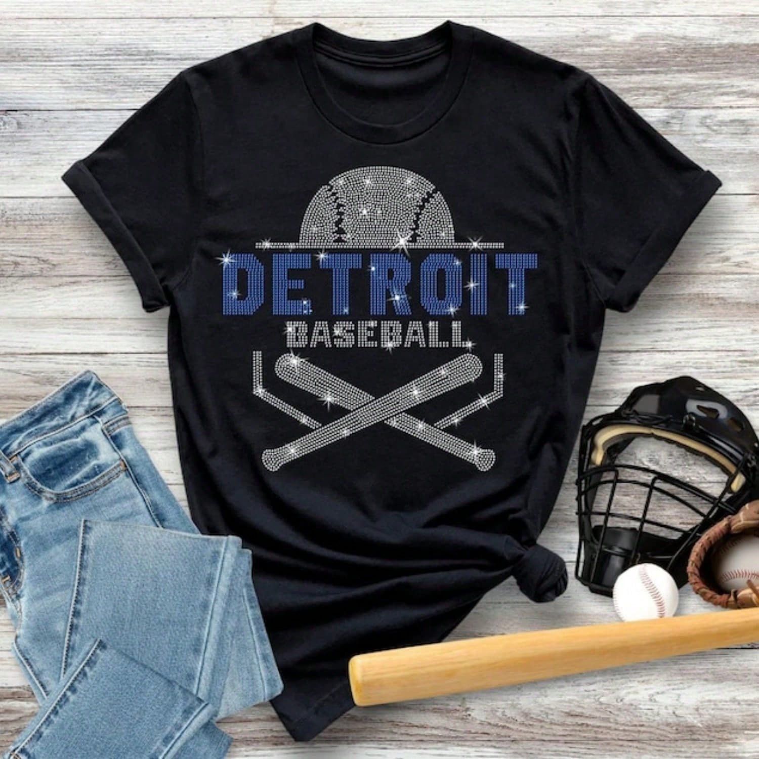 Detroit Baseball Rhinestone T-Shirt, Retro Sports Shirt, Glittering Baseball Tee, Team Port Shirt, Detroit Gift For Baseball Mom
