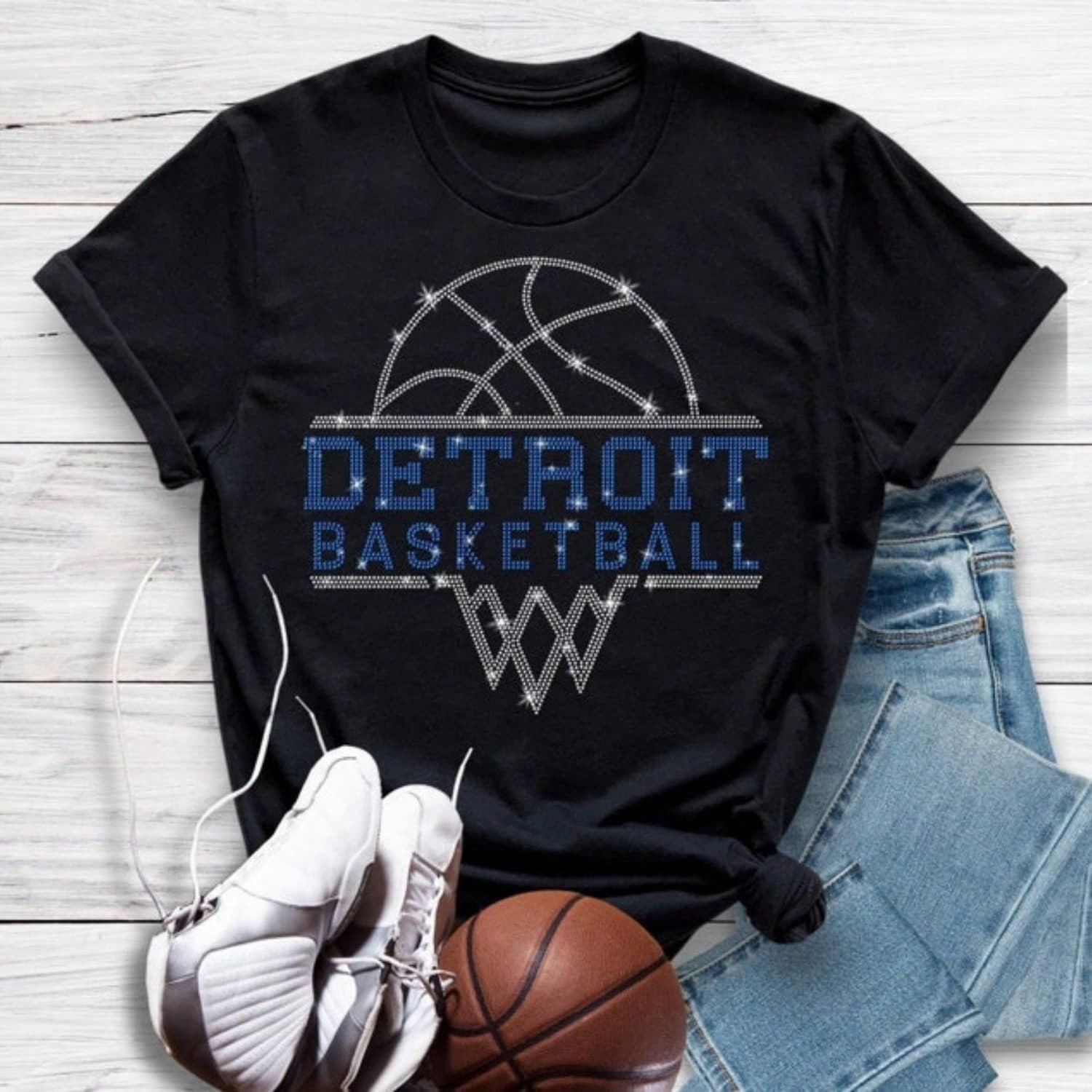 Detroit Basketball Sports Team Rhinestone T-Shirt, Basketball Lover Clothing, Sports Mom Fan Spirit Shirt, High-Quality Custom Print Shirt