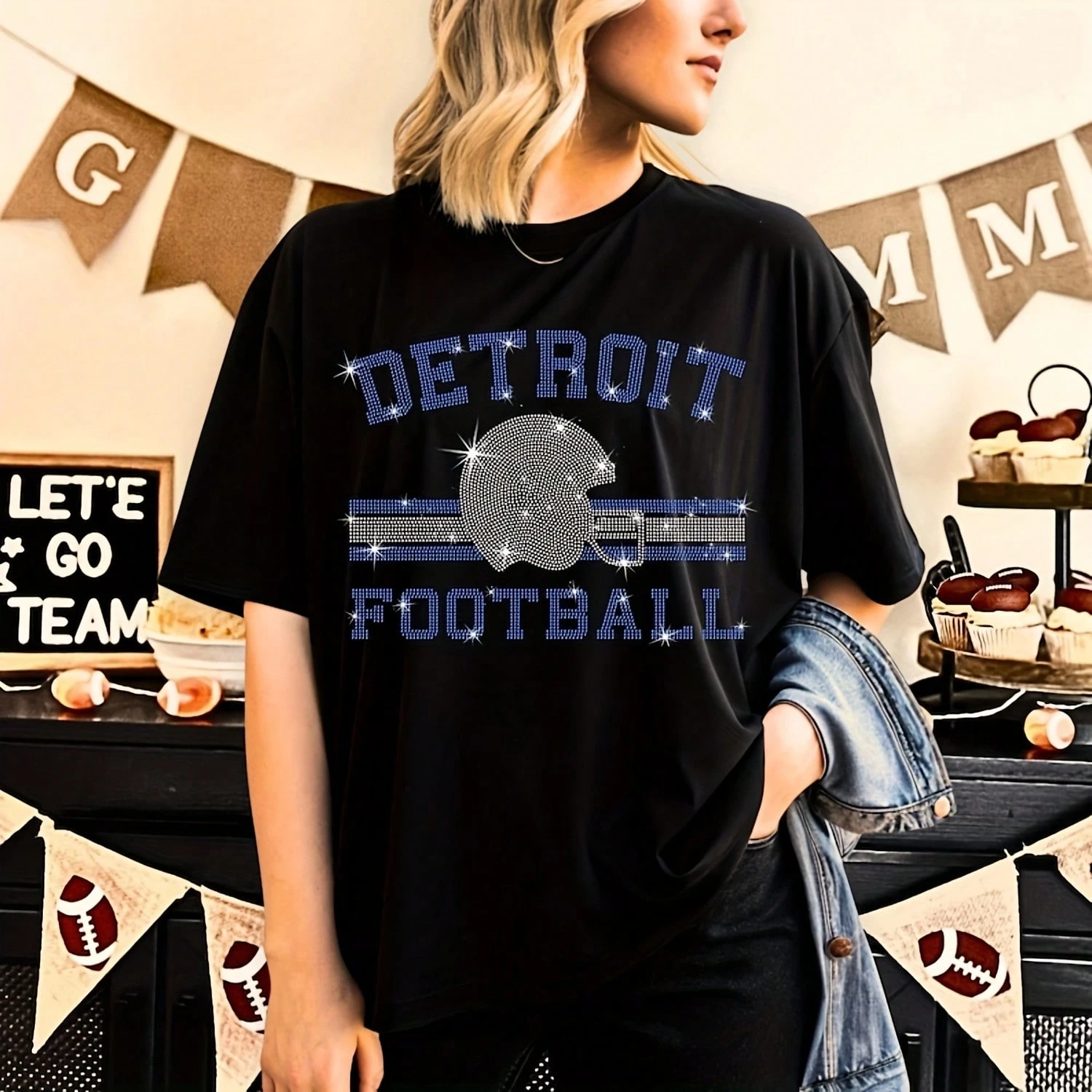 Detroit Rhinestone T-Shirt, Football Team Glittering Fan Shirt, Vintage Style Taiate Sunday Sports Shirt For Game Day