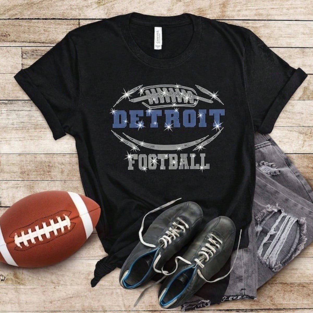 Detroit Rhinestone T-Shirt, Chic Design Sparkling Football Shirt, Shiny Fashion Eye-Catching Tee-Shirt, Glittering Fan Dazzling Team Shirt
