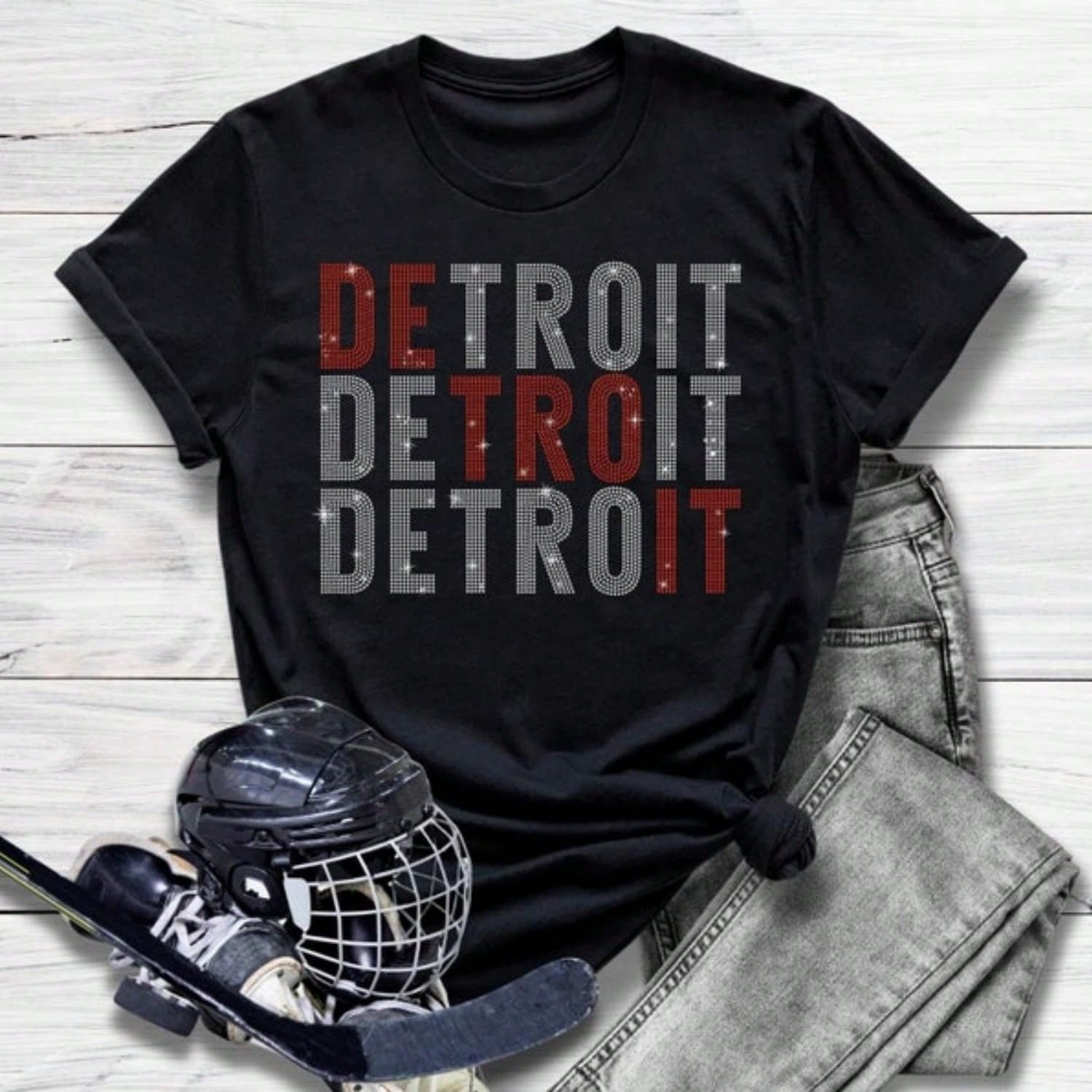 Detroit Rhinestone T-Shirt, Hockey Team Retro Sweatshirt, Uni Fans Sports Rel, Woman Hockey Fan Outfit, Cotton Jersey Adult Tee Shirt