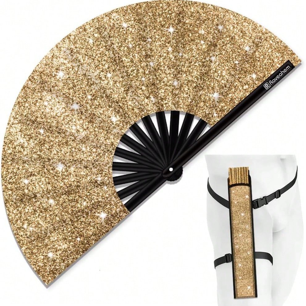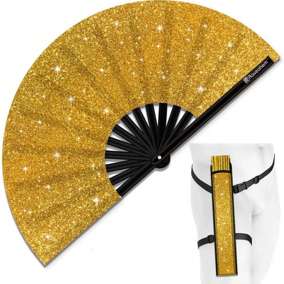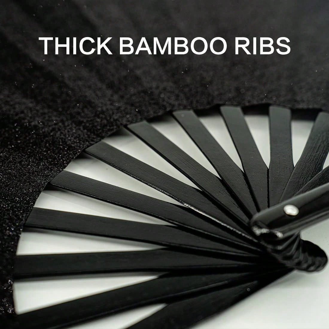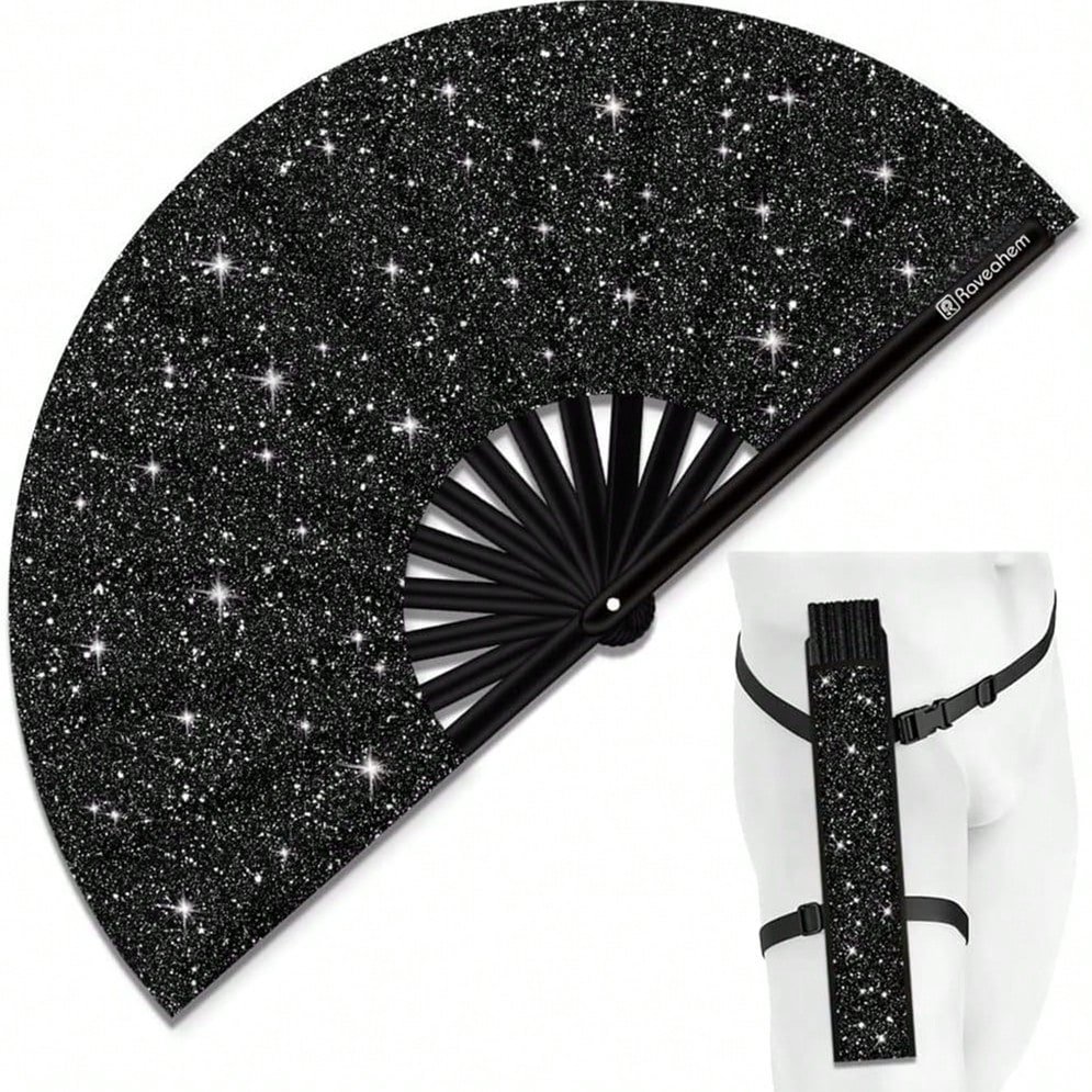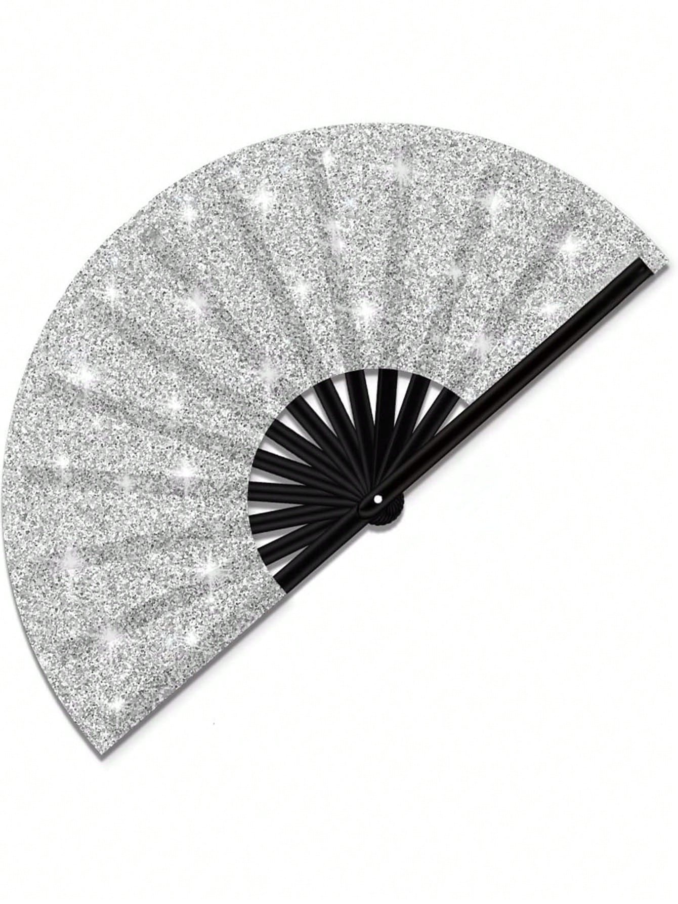 Glowing Big Carnival Folding Hand Fan, Suitable For EDM, Festivals, Clubs, Parties, Dancing Silver + Black, Shining