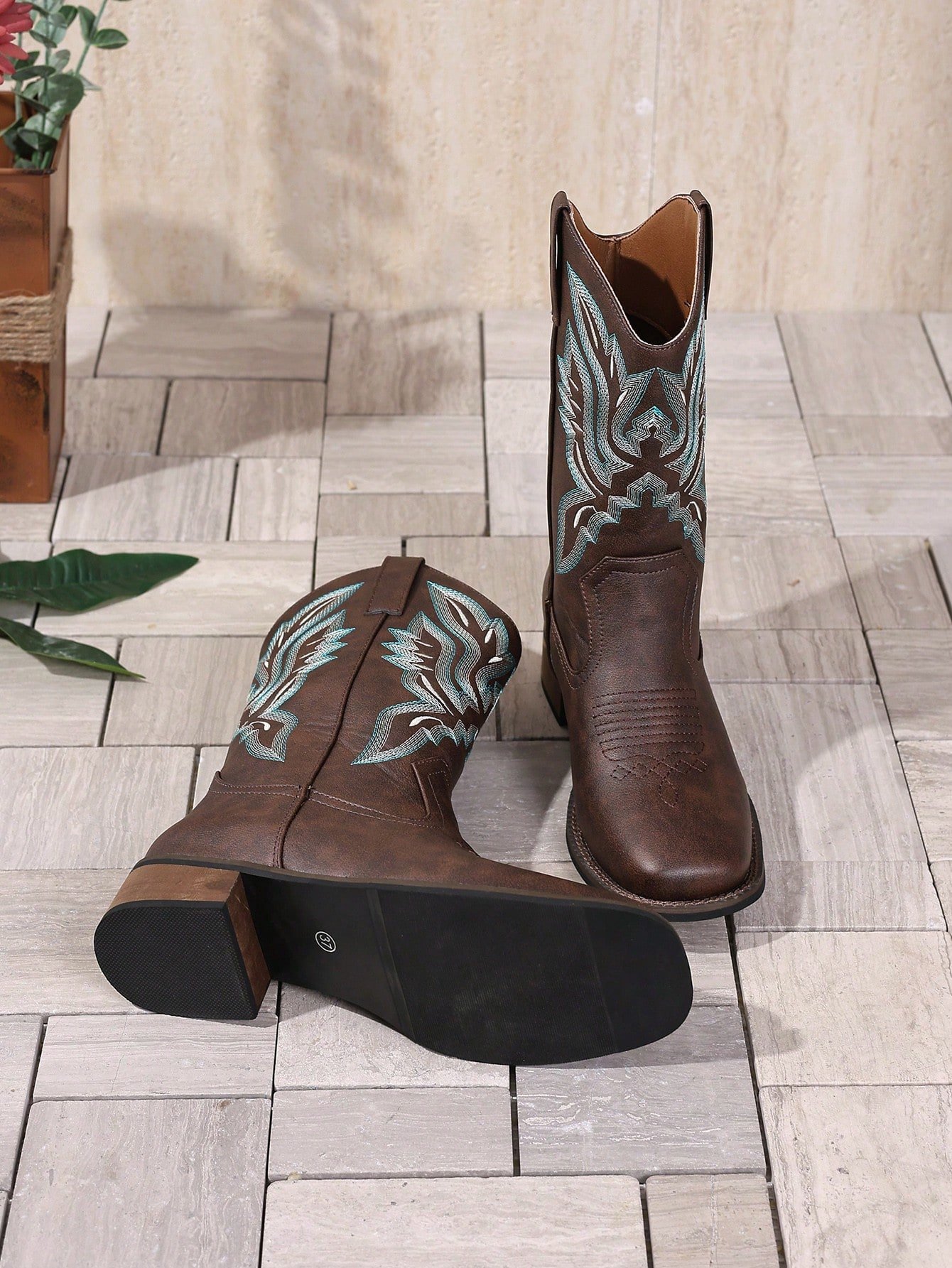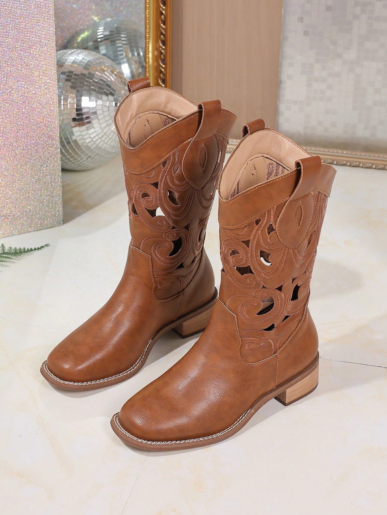 Chunky Heel Slip-On Embroidered Coffee Brown Western Boots, Square Toe Mid-Calf Boots, Fashion Versatile Cowboy Boots For Autumn/Winter, New Design Short Brown Wooden Heel Cowgirl Boots