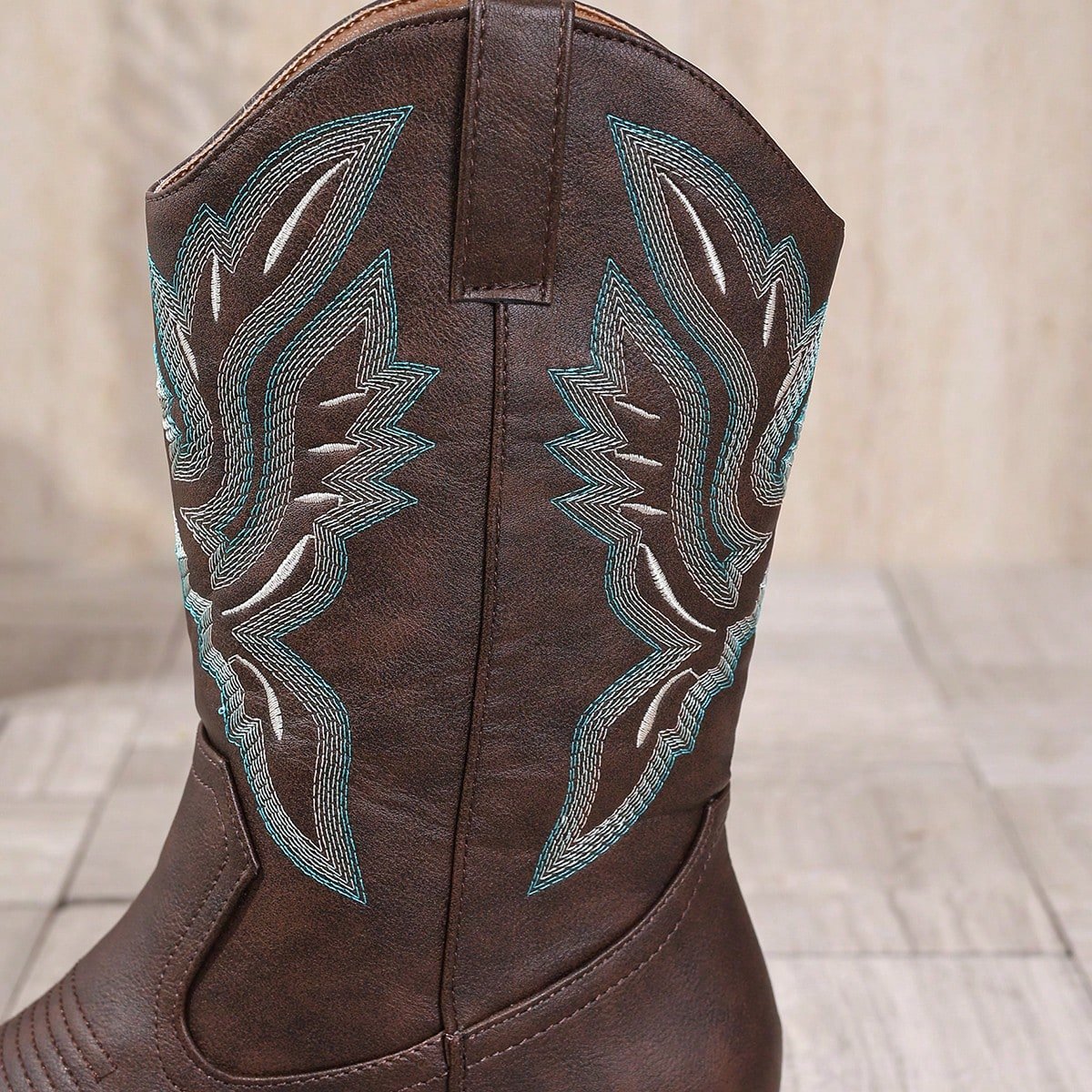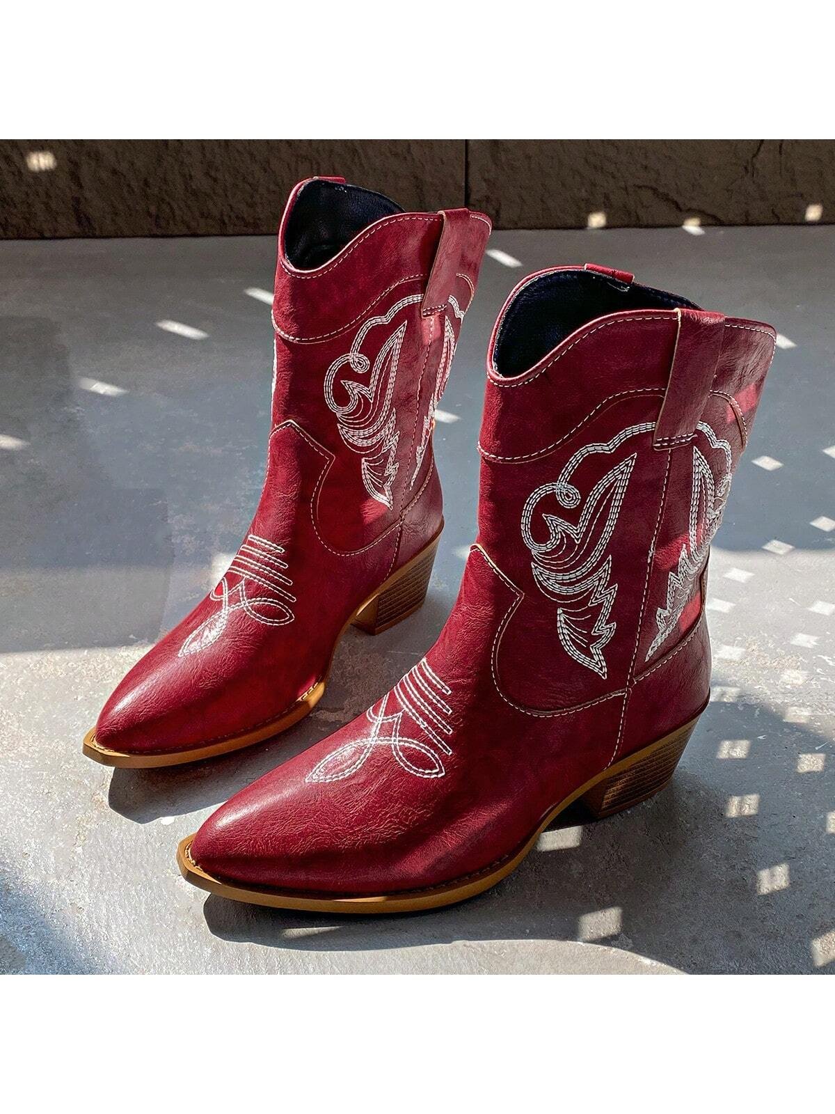 Women's Embroidered Vintage Textured Pointed Toe Chunky Heel Mid-Calf Western Boots