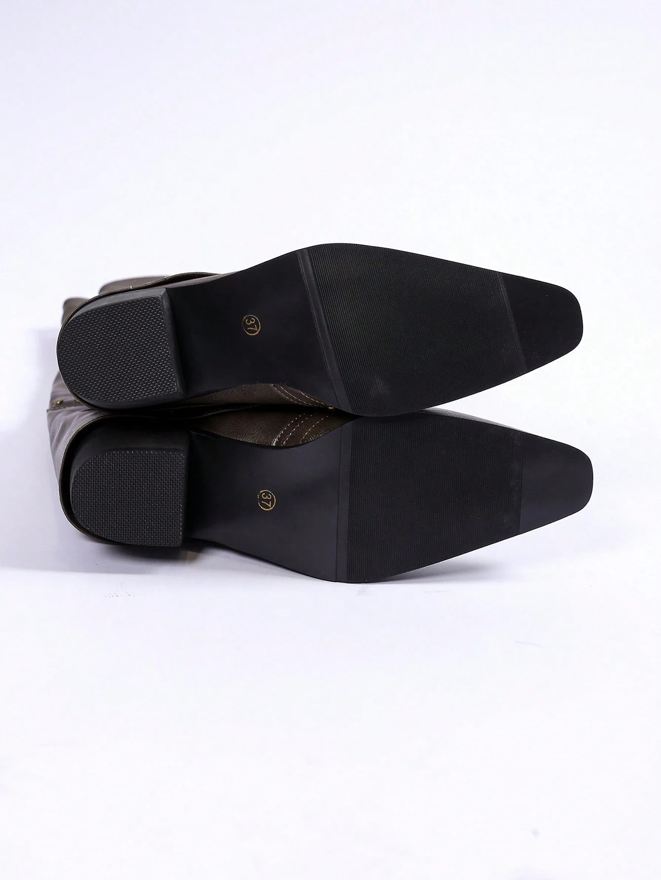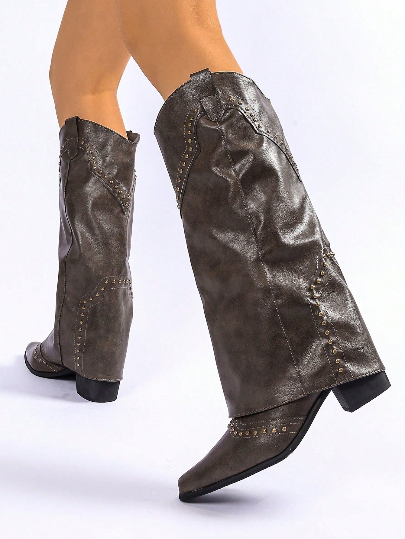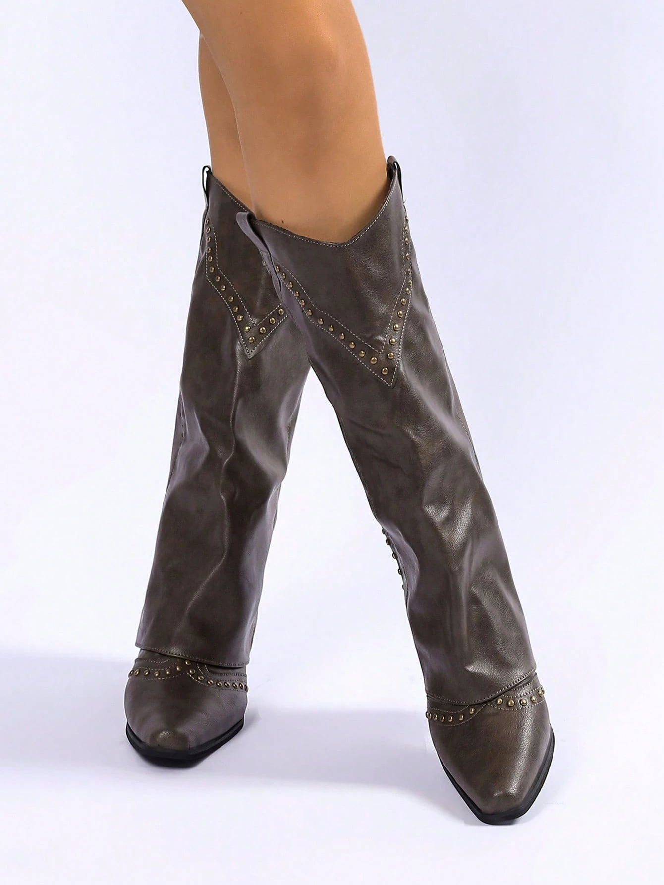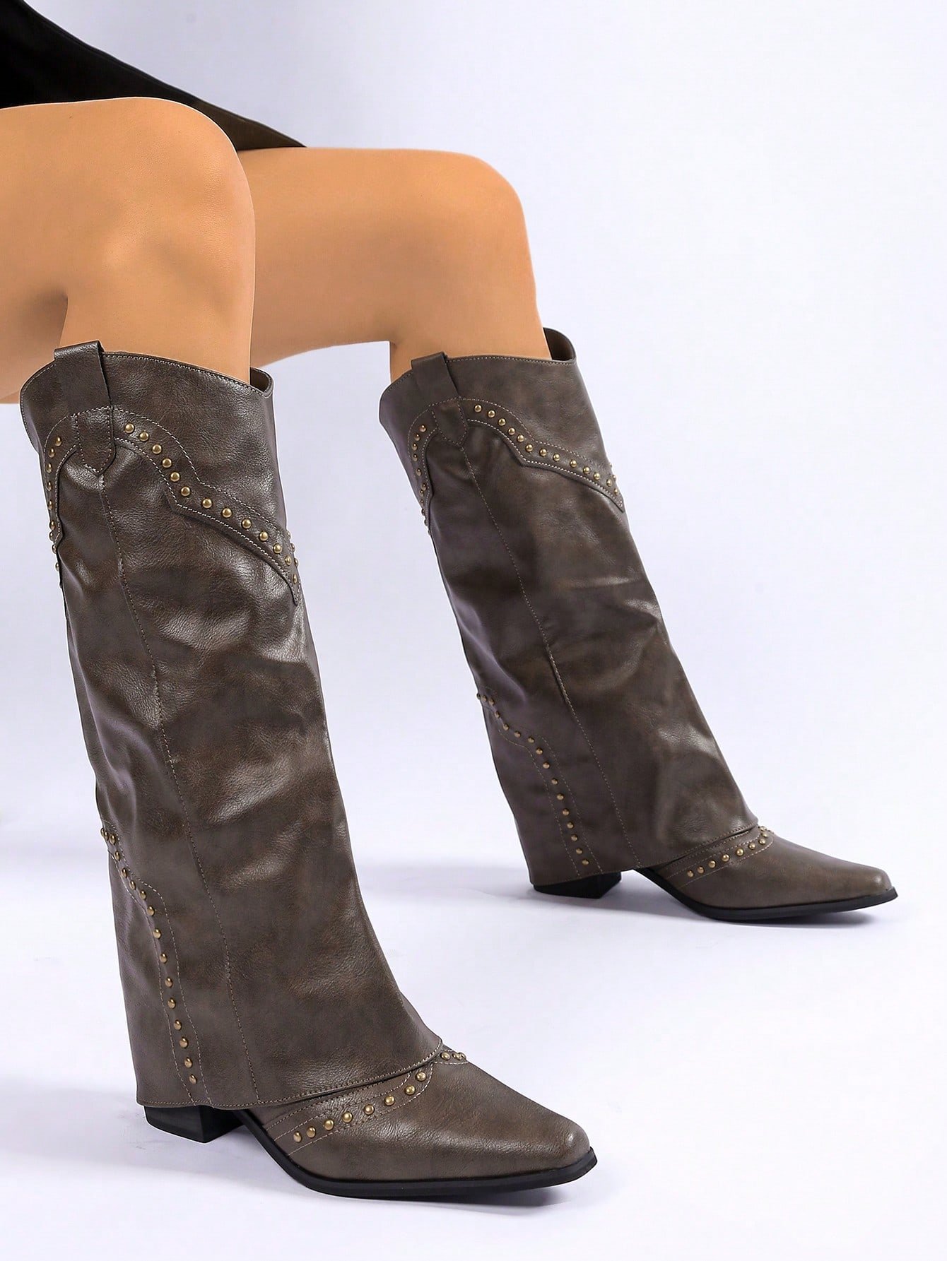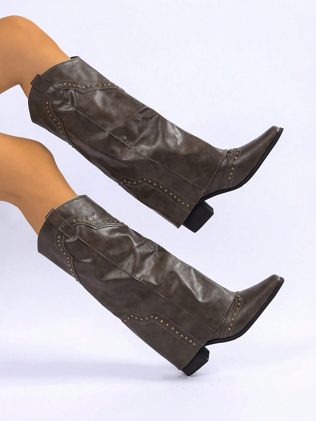 Women Khaki Chunky Heeled Square Toe Vintage Rivet Tall Shaft Boots, Versatile French Cowgirl Riding Boots, Suitable For Petite